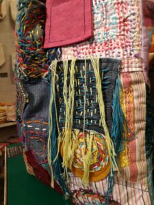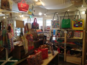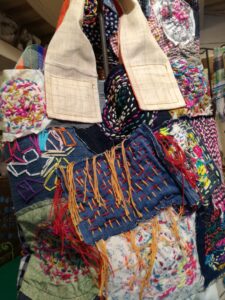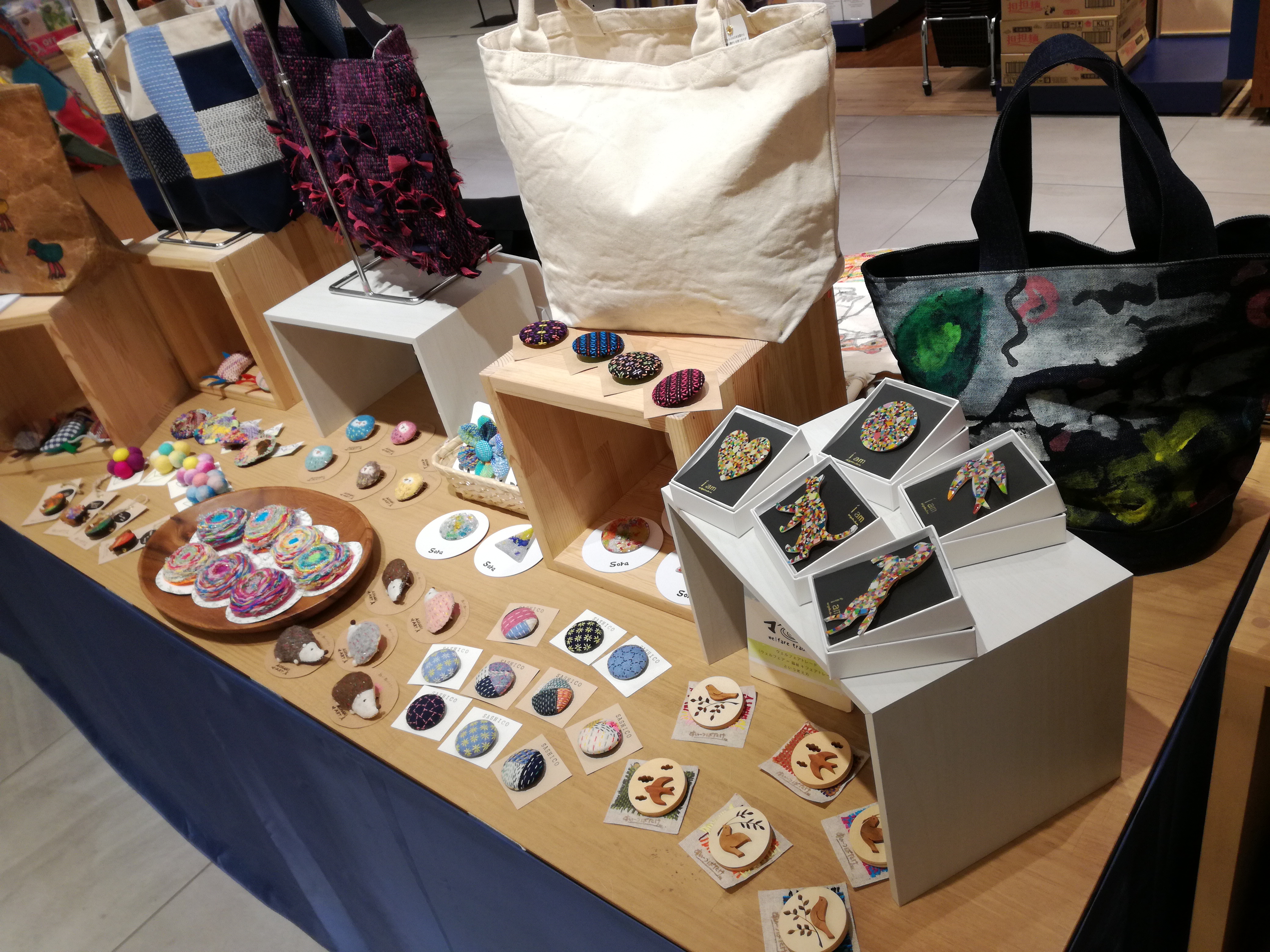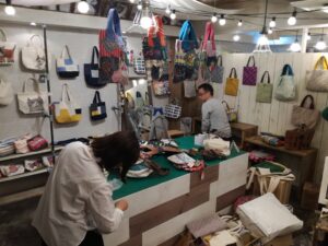 早速お客様に、「こちらのバッグを作られた作業所の方です」とご紹介すると Mさんが、バッグにちりばめられた刺繍した生地を一つひとつ 「これはこんな方が作っていて」とか「これは凄く貴重な刺繍なんです!」などなど 説明をしてくださいました!