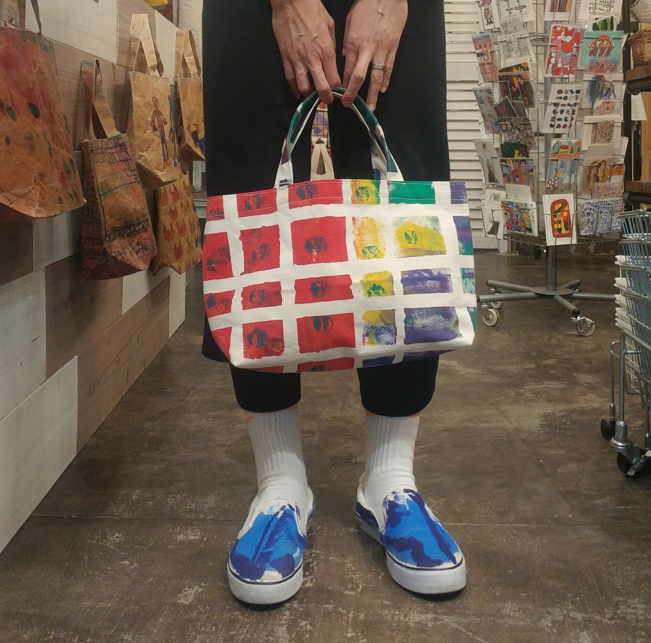 この、ふれあいさんがペイントしたバッグも素敵でしょう?靴との相性もばっちり。